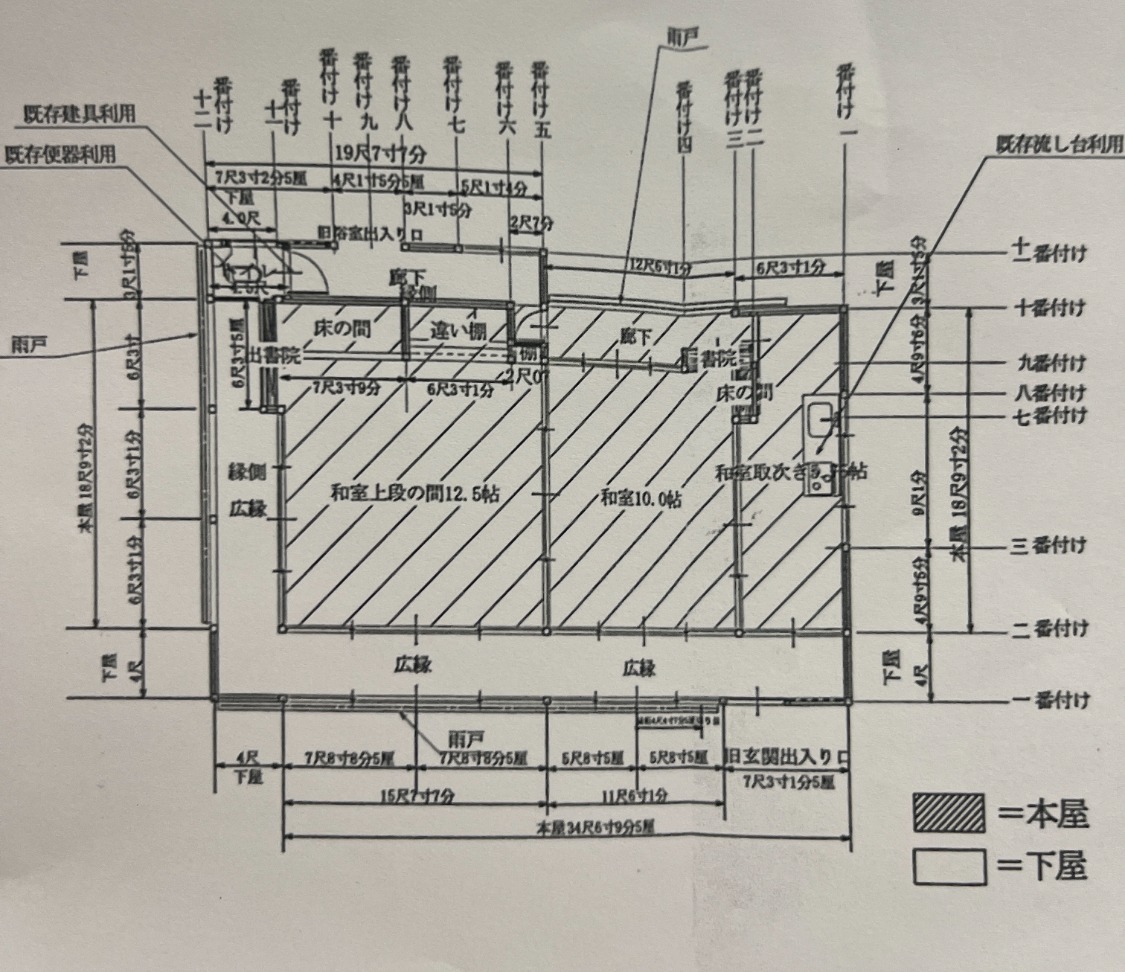 Esta residencia de una sola planta presenta una distribución tradicional japonesa de 2K, centrada en la amplitud y la luz natural. El núcleo de la vivienda consta de dos grandes habitaciones de tatami interconectadas: una sala formal de 12.5 esteras (aprox. 20 m² / 215 ft²) situada en el lado oeste, que incluye un nicho ornamental (Tokonoma) y estanterías empotradas, y una sala central de 10.0 esteras (aprox. 16 m² / 172 ft²). En el lado este, se encuentra un espacio de transición de 4.5 esteras (aprox. 7 m² / 75 ft²) cerca de la entrada. Los perímetros sur y oeste están rodeados por amplias galerías de madera (Engawa), que funcionan como pasillos iluminados que conectan el interior con el jardín. Las áreas funcionales incluyen un aseo ubicado en la esquina noroeste y una serie de pasillos traseros que permiten un acceso eficiente a toda la edificación.