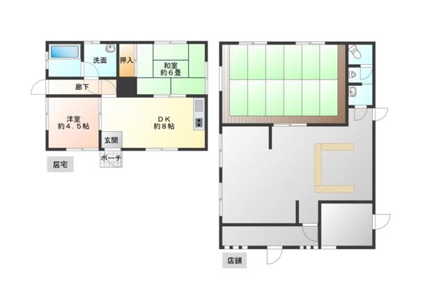 ◾️Main Residence (2DK Layout): The main living quarters feature a functional 2DK (2 Bedrooms, Dining, Kitchen) design. Upon entering through the porch and entrance hall (Genkan), you are welcomed into the Dining & Kitchen (DK) area, measuring approximately 8 mats (12.9 m² / 139 ft²), which serves as the central hub. To the side lies a Western-style room, sized at 4.5 mats (7.3 m² / 78 ft²), ideal for a bedroom or study. At the rear, there is a classic Japanese-style Tatami room of 6 mats (9.7 m² / 105 ft²), complete with a traditional closet (Oshiire). The layout includes a separate toilet and a bathroom area with a washbasin and unit bath, accessible via a small hallway, ensuring privacy. ◾️Annex Building (Shop/Studio): The separate annex is a spacious structure designed for commercial or recreational use. It features a large open floor plan with a service counter area, suitable for a cafe, shop, or studio. A significant portion of the space is dedicated to a raised Tatami area (approx. 10 mats / 16.2 m² / 174 ft²), perfect for lounge seating or guest accommodation. The annex is well-equipped with two separate restrooms and a back storage/utility room, making it fully independent from the main residence.