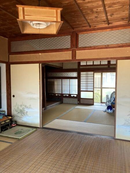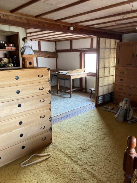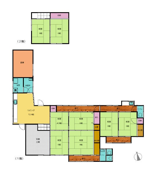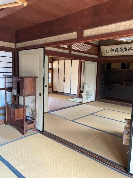 This spacious home features a versatile two-story layout. The first floor includes a 12.4-mat living room (approx. 20 m² / 216 ft²), a kitchen, a bathroom, and a washroom. This floor also hosts four traditional Japanese-style tatami rooms—sized at 8-mat (approx. 13 m² / 140 ft²), 6-mat (approx. 10 m² / 105 ft²), another 6-mat, and 4.5-mat (approx. 7 m² / 78 ft²)—along with a large storage warehouse, two toilets, an earthen-floor entrance (Doma), and ample closet space. The second floor consists of two additional 6-mat Japanese-style rooms, perfect for bedrooms or quiet retreats, and a storage closet.