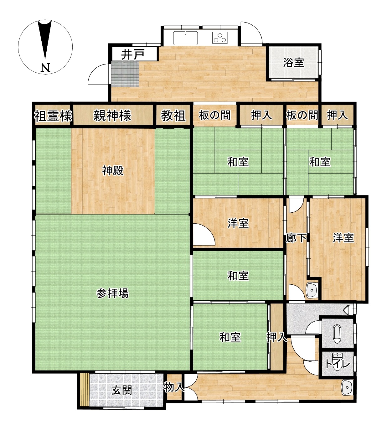 This single-story, 127 m² (1367 ft²) property is uniquely divided into a large worship space and a private residential wing. The southern entrance opens into an expansive tatami-matted worship hall (Sanpaijo), which leads to a formal shrine (Shinden) at the northern end. The residential section on the eastern side comprises four traditional Japanese-style tatami rooms and two Western-style rooms, providing flexible living options. This wing is completed by a kitchen, a bathroom, and a separate toilet, all connected by a hallway.
