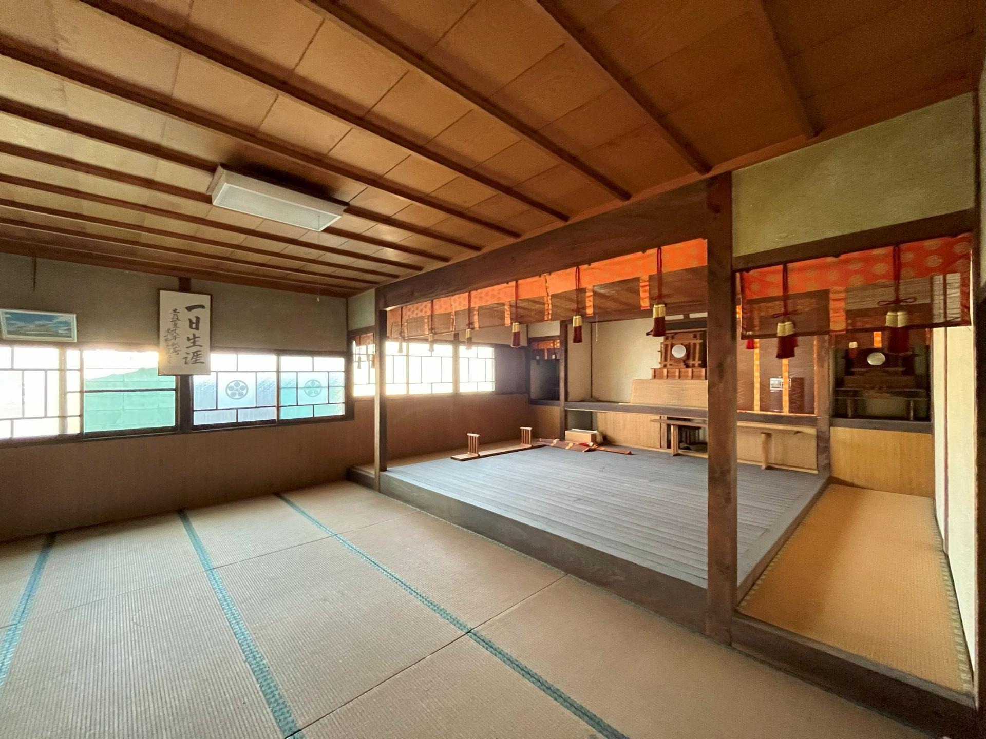 The property boasts a generous 6DK layout (6 rooms, a dining area, and a kitchen) spread across a 127 m² (1367 ft²) building on a vast 511 m² (5500 ft²) lot. The traditional wooden structure, featuring multiple tatami rooms, evokes a sense of timeless Japanese aesthetics. The most distinctive feature is the inclusion of a private shrine and worship hall on the premises—a truly rare find that opens up a world of possibilities.