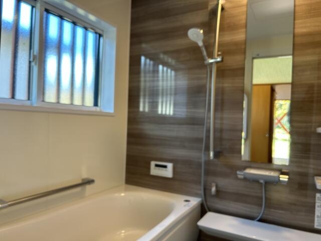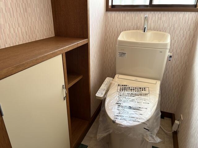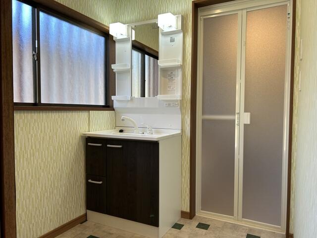 This single-story bungalow features a functional and open-concept design centered around a spacious Living, Dining, and Kitchen (LDK) area. The heart of the home is a 19 m² (205 ft²) LDK that provides a seamless flow for daily life. Adjoining this central space are two traditional Japanese-style rooms: a primary bedroom of 13 m² (140 ft²) and a secondary bedroom of 10 m² (108 ft²), both equipped with built-in storage (Oshi-ire). The service wing is efficiently clustered on the west side, including a dedicated entrance hall, a separate toilet, a washroom/dressing area, and a bathroom with a window. A standout feature is the expansive wooden deck running along the entire southern facade, which significantly extends the living space outdoors and captures abundant natural light.